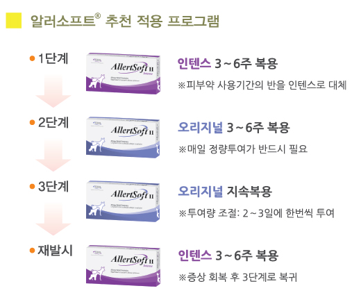 | 알러소프트 투여 프로그램 | 인텐스-오리지널 혼합 복용으로 효율성 극대화 | 평생 알러지 관리 가능 |