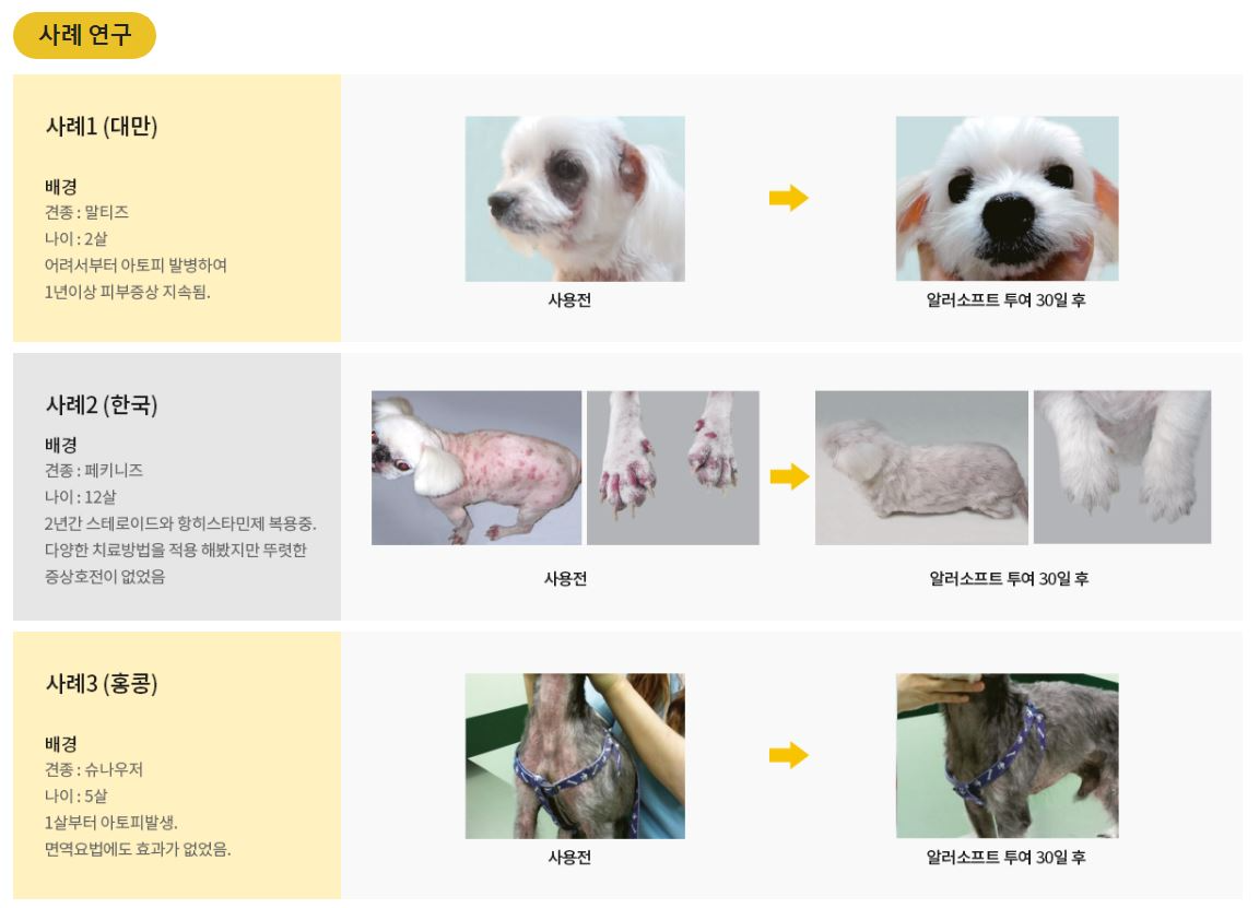 4.피부약 혼합복용 프로그램: 피부 처방약을 먹이는 기간 알러소프트를 함께 복용하며 피부약 처방이 종료된 이후에도 알러소프트를 꾸준히 복용함으로써 부작용 없이 증상개선 효과를 장기간 유지할 수 있습니다.