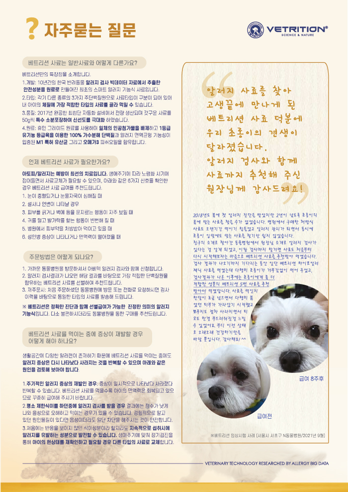 Vetrition® 하이포알러제닉 사료는 한국 반려동물 알러지 체질검사 빅데이터에서 도출된 최적화된 포뮬러를 균형잡힌 영양과 함께 제공합니다.