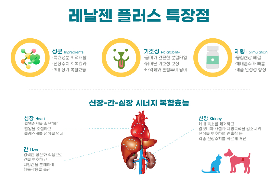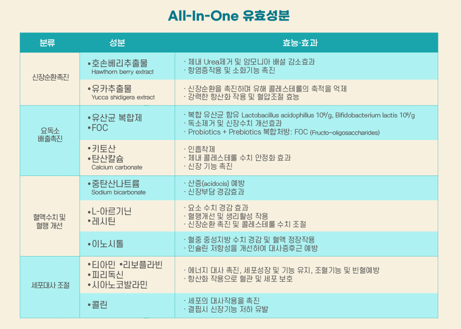 | 국내유일 15종 복합성분 함유 | 부작용 우려 없이 강력한 신장기능 회복 효과 | 안전성과 효능 동시보장 |